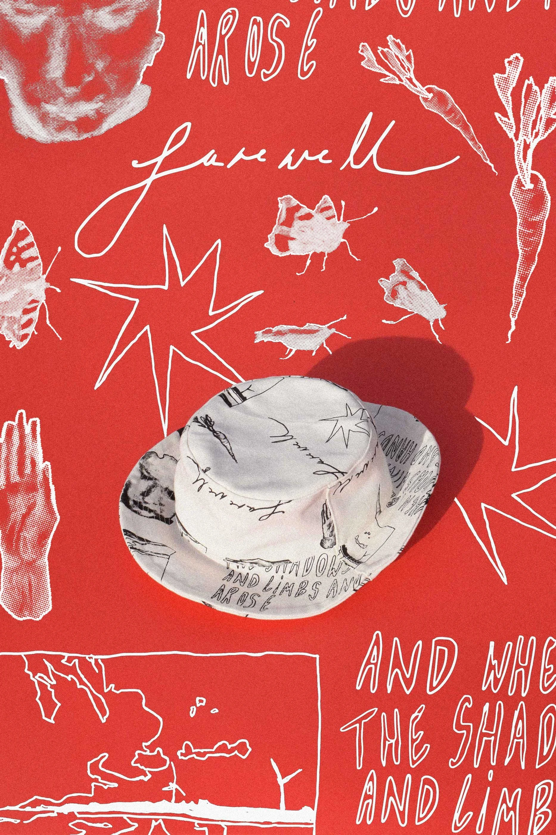 The artworks which feature on the Thirteen Hat are a collation of drawings created by Isobel in her sketchbook. From beach scenes and carrots to intricate hands and poetry, the printed canvas tells the narrative story of particular period in time